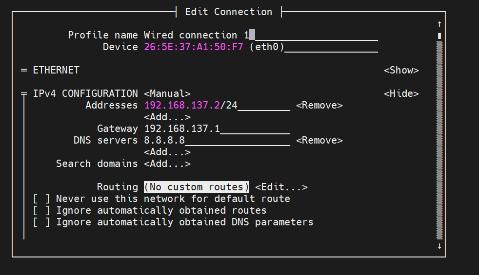 找到 Wired connection 1 或者 eth0 相关的名字,选中它,再按右方向键选择 Edit,回车。然后我们就进入了下面界面,就在这个界面配置 ip 相关信息: