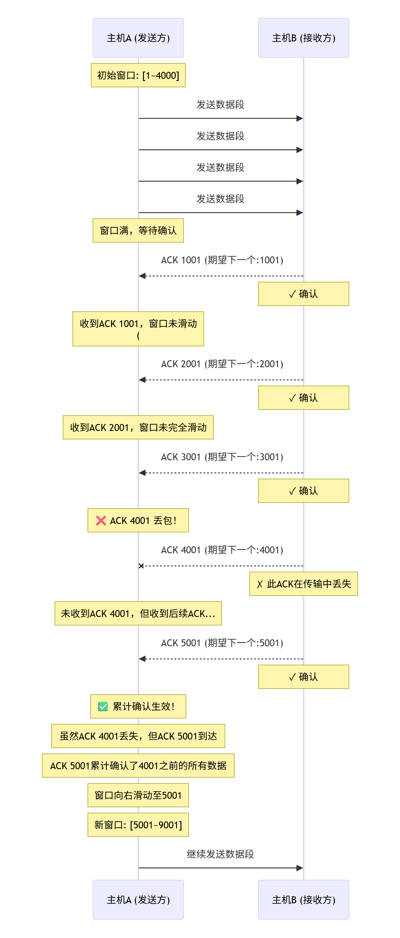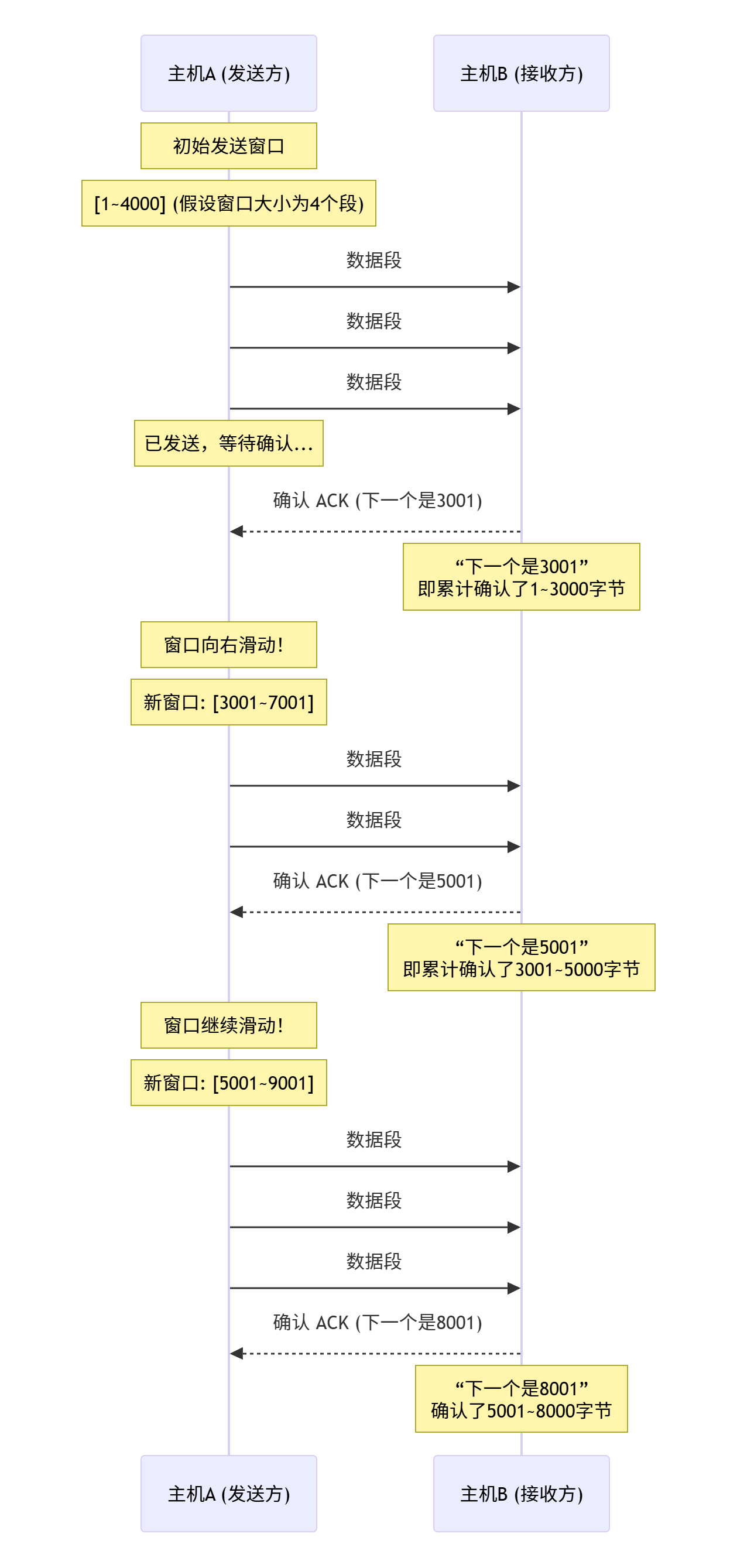 仔细思考,会发现,上面的应答机制效率不行,如果发送方必须等到应答之后才能发送下一条消息的话,那效率就很低,所以实际tcp是一次性发送多条消息,然后等接受方发送应答。这时候又有新的问题了,如何确定收到的应答是对应哪几条报文呢?