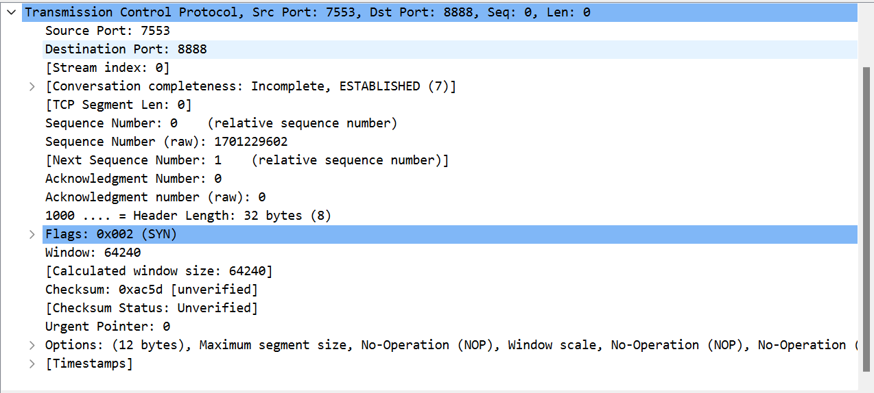 方TCP头部有多长。通常,没有可选项的TCP头部长度是20字节(即doff为5,因为