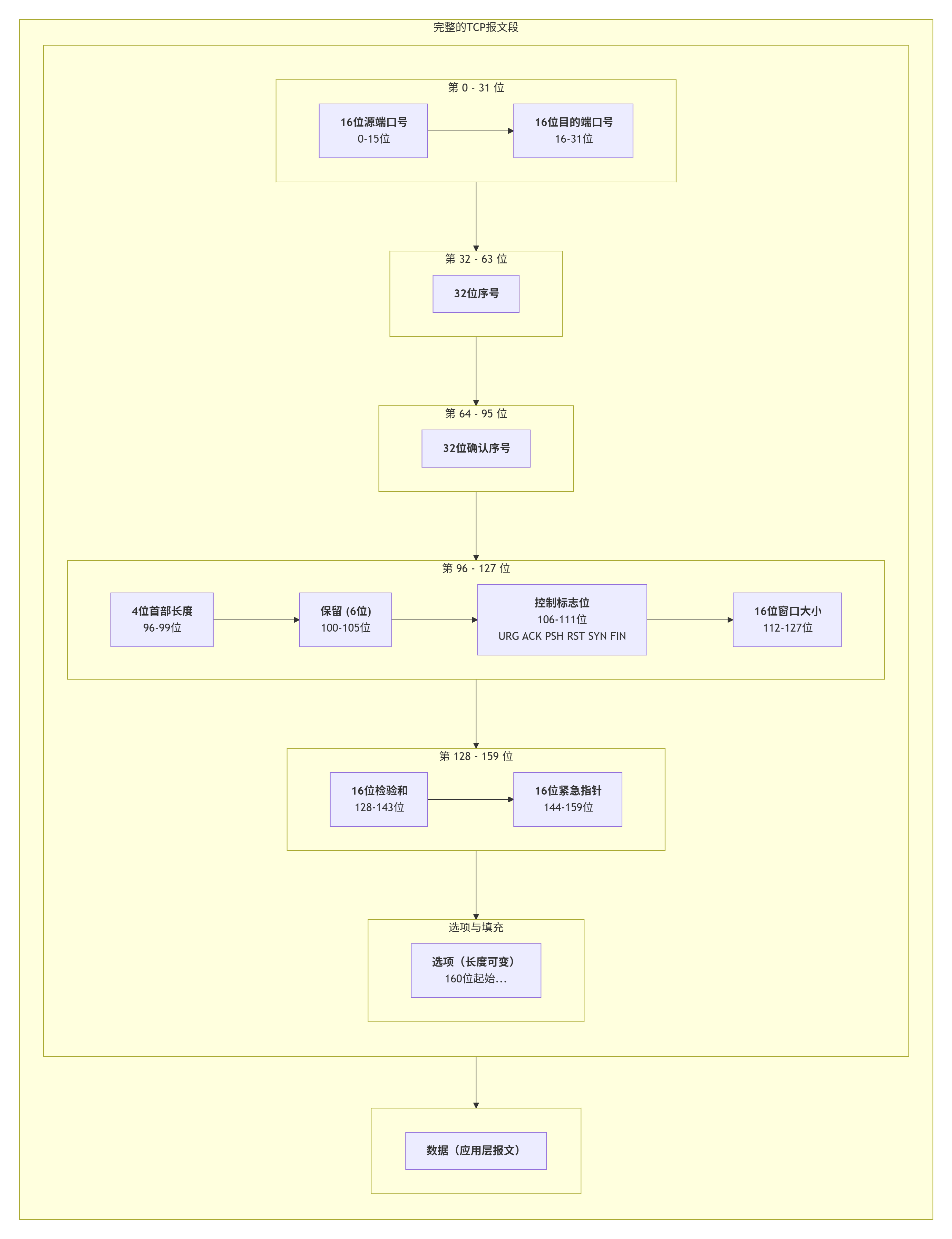 对于4位首部长度和40位选项的理解,标准的tcp报头长度只有20个字节(没有选项),但tcp报头是可变长度,又因为4位首部长度中,基本单位是4字节,也就是说,一个tcp报头的长度是[20,60]字节。当只有20字节的时候,也就是说首部长度应该是0101即5。另外,因为首部长度的基本单位是4字节,因此,每个选项都需要4字节对齐(也就是说一个选项占4个字节)。其实不管标志位究竟有没有,只要明确报头最少有20个字节,且一定有首部长度,就可以把报头(包括选项)和有效载荷分离了。