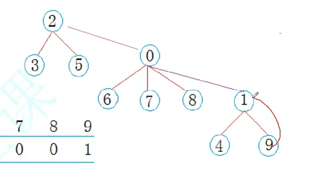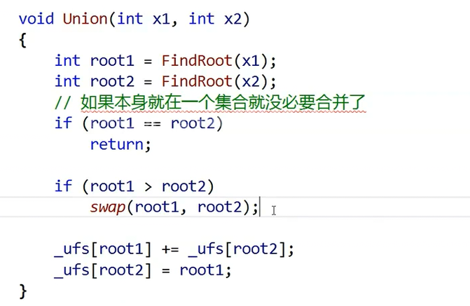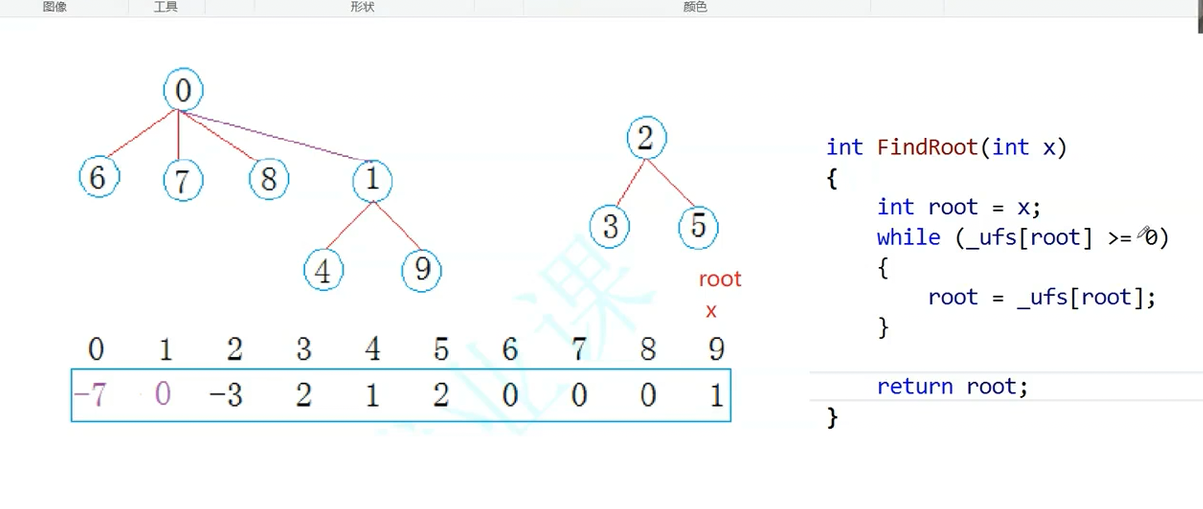 沿着数组表示的树形关系往上一直找到树的根,如果根相同表明在同一个集合,否则不在 - 将两个集合归并成一个集合