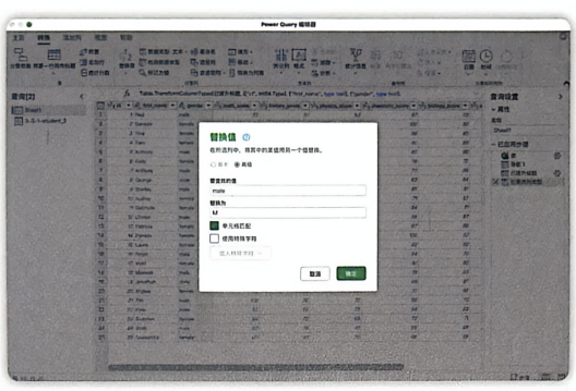 gender列。然后在【转换】选项卡下,点击【替换值】。在弹出的对话框中,将"female"替换为"F",将"male"替换为"M"(见图3-27)。点击【确定】。