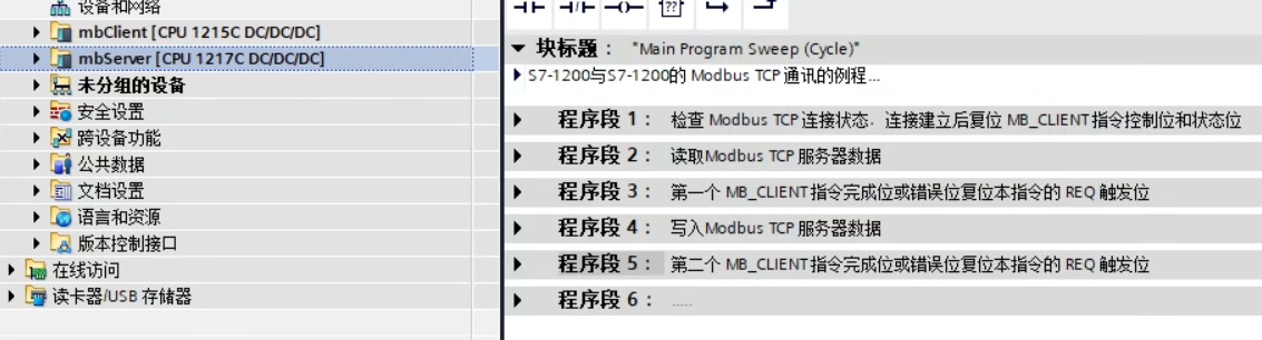 西门子S7-1200与S7-1200的 Modbus TCP 通讯示例 实现功能: S7-1215C作为客户端,S7-1217C作为服务器,S7-1215C读取S7-1217C的40001~40008的数据并存储到MW100 ~ MW114, 将MW116 ~ MW130 的数据写入到S7-1217C的 40009~40016