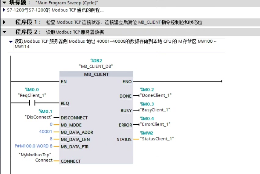 在OB1里放第一个MB_CLIENT块负责读取: