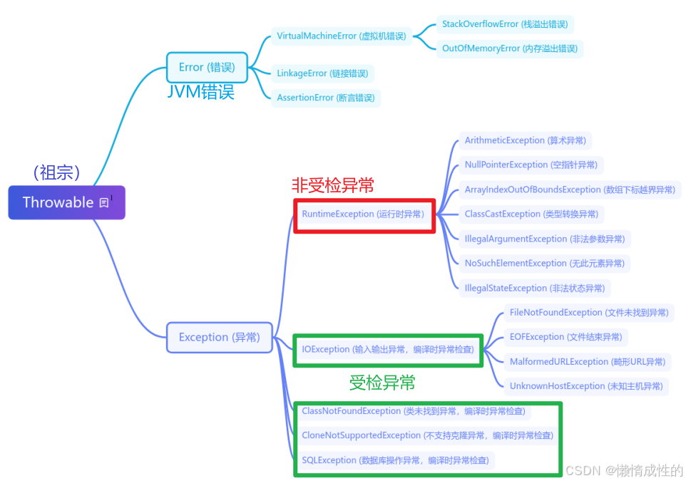 本质是代码编写错误导致运行时问题(如算术、数组下标越界、空指针异常),继承自RuntimeException,不强制处理