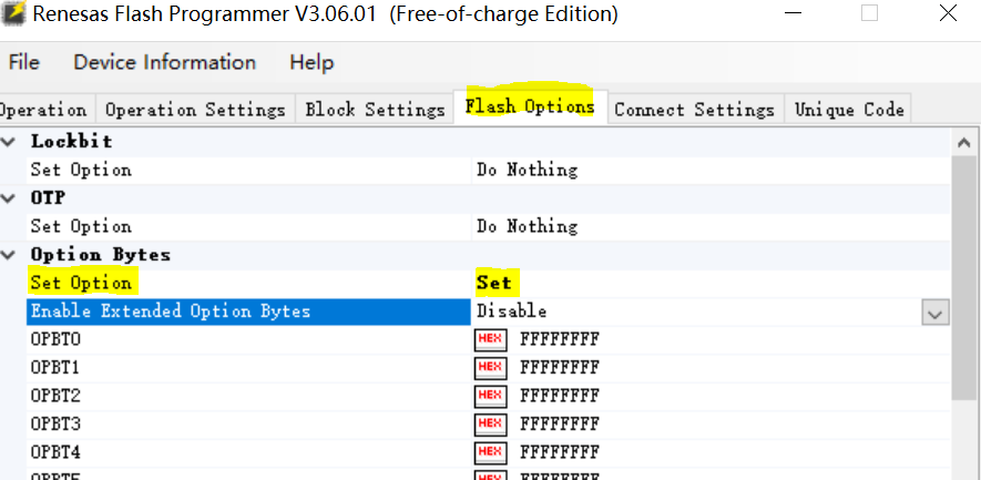 根据实际硬件及MCU配置需求,修改OPBT0、OPBT1、OPBT2等参数。注意,不要随意设置Option Byte,需要结合实际硬件及MCU手册进行配置。