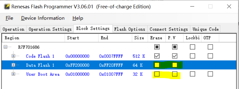 在「Block Settings」选项卡中,仅勾选需要刷写的程序存储区域(如图中的Code Flash 1),取消其他无关区域(如Data Flash、User Boot Area)的勾选,精准限定刷写范围。