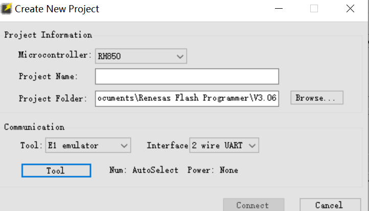 在"Communication"的Tool选项中选择"E2 emulator"或者"E1 emulator"作为编程工具。