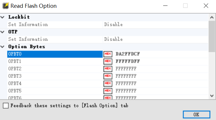 点击"Read Flash Options"按钮,就可以读取MCU当前的Option Byte的配置值。