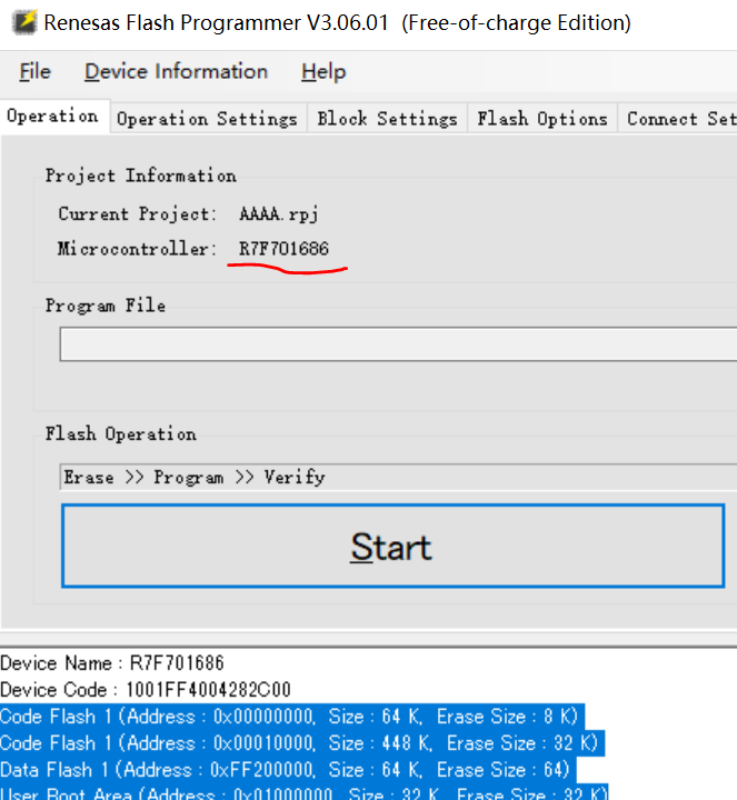 连接上设备之后,可以看到设备的名字(R7F701686是微处理器的型号)以及设备Code。还能够自动分配CodeFlash以及DataFlash的信息。