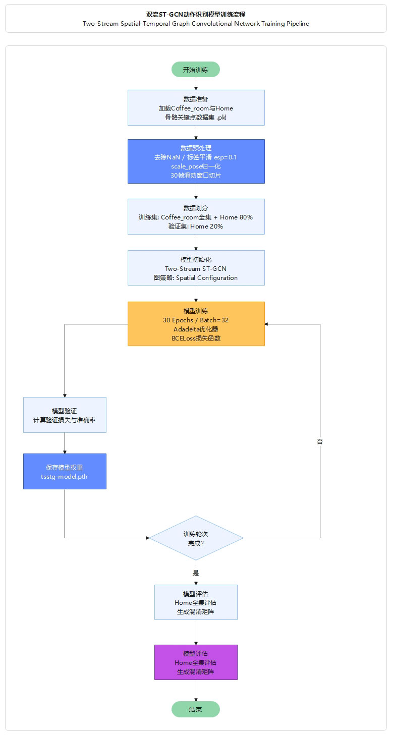 双流ST-GCN同时建模关节位置与运动速度特征,结合多帧确认与冷却机制,有效区分摔倒与躺下等相似动作,降低误报率。
