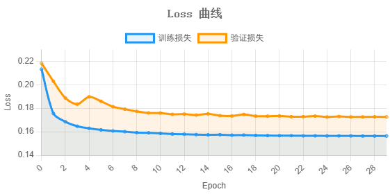 训练损失与验证损失均在前 10 轮快速下降后趋于平稳,最终分别收敛至 0.1564 和 0.1726,两条曲线走势一致且间距较小,表明模型泛化能力良好。