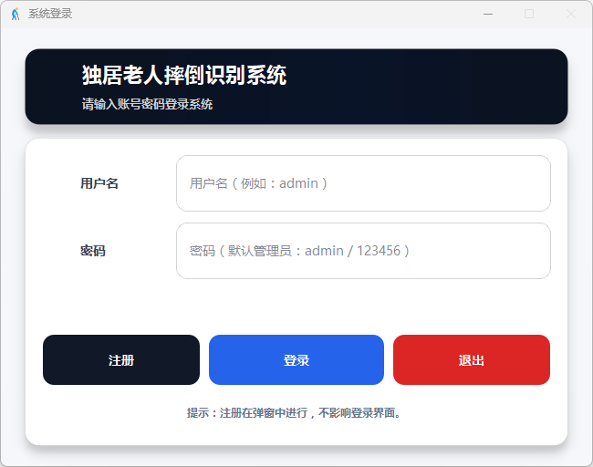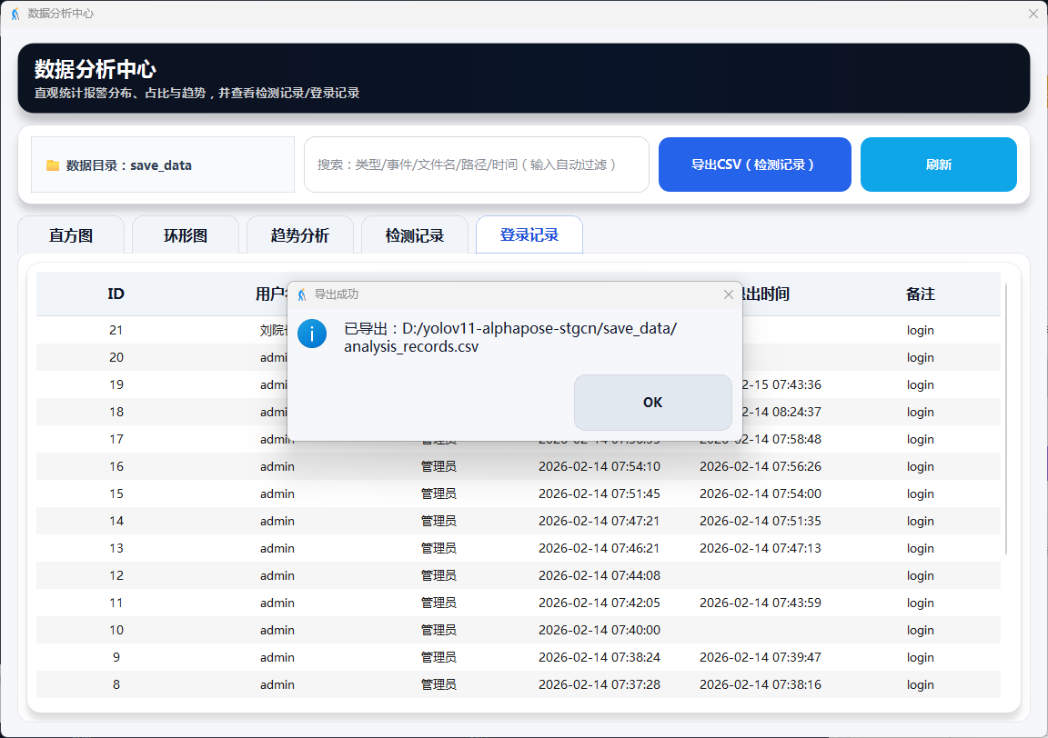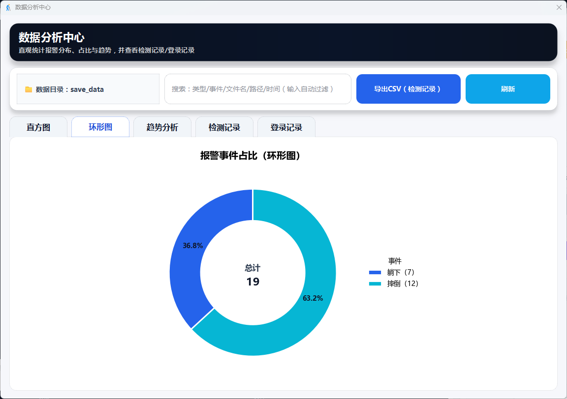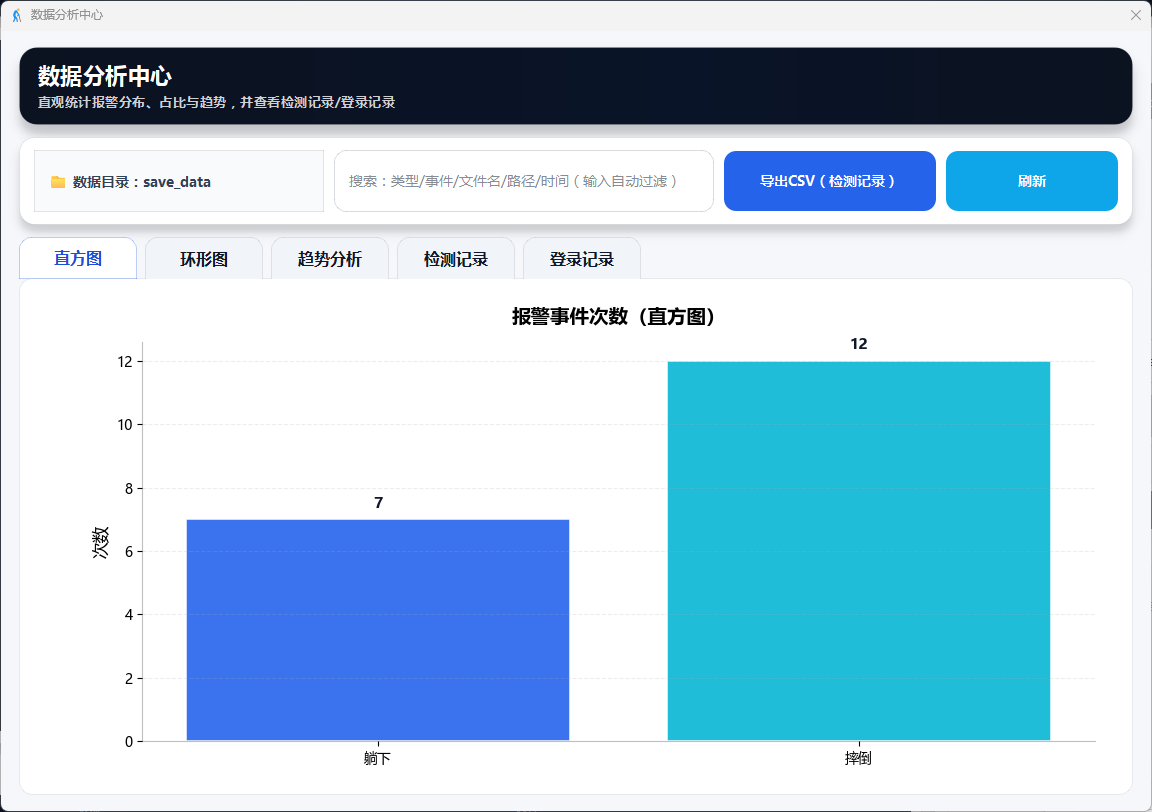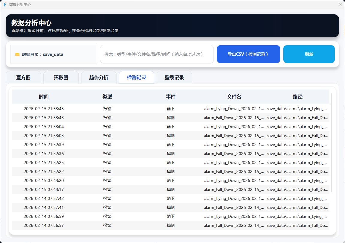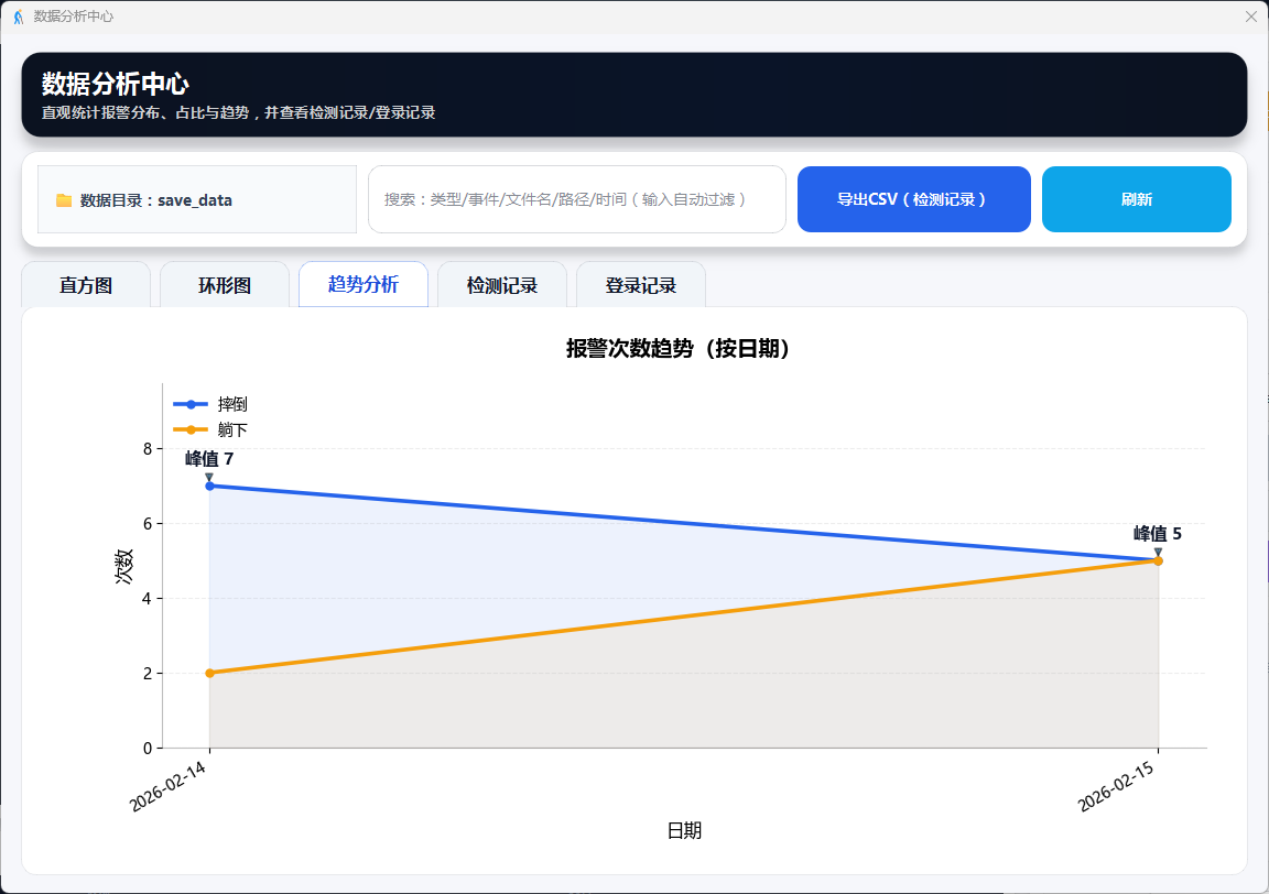 支持视频文件与摄像头双模式输入,实时识别7类人体动作并在检测到摔倒时触发画面红框、语音播报、邮件通知三重报警,同时提供用户登录管理、报警截图与事件视频自动保存、结构化日志记录及可视化数据分析功能。