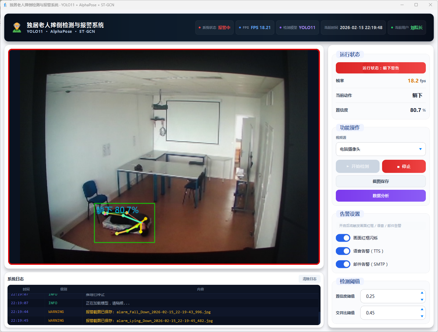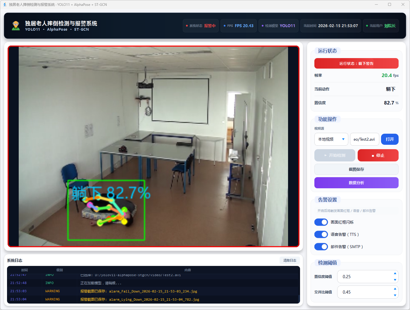 系统采用骨骼关键点而非原始图像进行动作识别,降低计算量的同时规避隐私问题;工程上将 YOLO11、AlphaPose、ST-GCN 三模型整合为 GPU 实时流水线,配合卡尔曼滤波跨帧跟踪保证多人场景连续性;应用上集成语音、邮件、画面三重报警与冷却防误报机制,结合日志 记录与数据分析形成检测到追溯的完整闭环,可为独居老人居家监护及智慧养老场景提供低成本、可扩展的技术支撑。