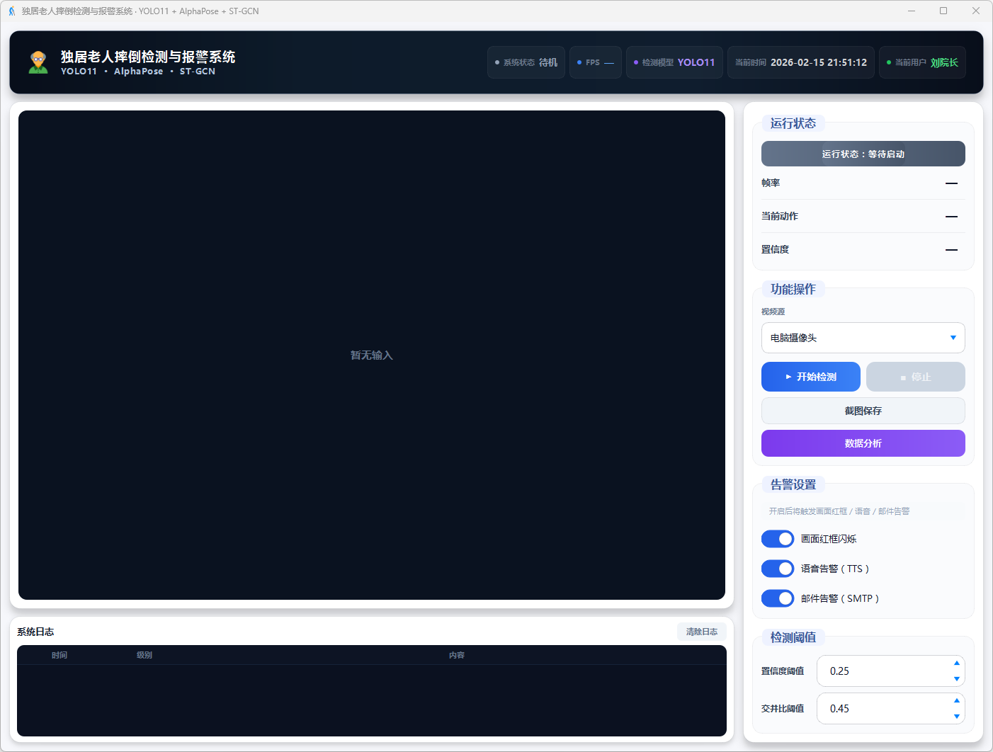 本系统实现了从视频输入到摔倒报警的完整功能闭环。在输入端,支持本地视频文件与电脑摄像头两种视频源接入方式。在识别端,系统对视频流进行实时处理,逐帧完成人体检测、骨骼关键点提取与动作分类,可识别站立、行走、坐着、躺下、起立、坐下及摔倒共7类动作。在报警端,当检测到摔倒动作时,系统经多帧确认后触发画面红框闪烁、语音播报及邮件通知三重报警联动,并自动保存报警截图与事件前后各5秒的视频片段。在管理端,系统提供用户登录与注册、检测阈值调节、告警开关配置、系统日志实时查看及历史报警数据的可视化统计分析功能。