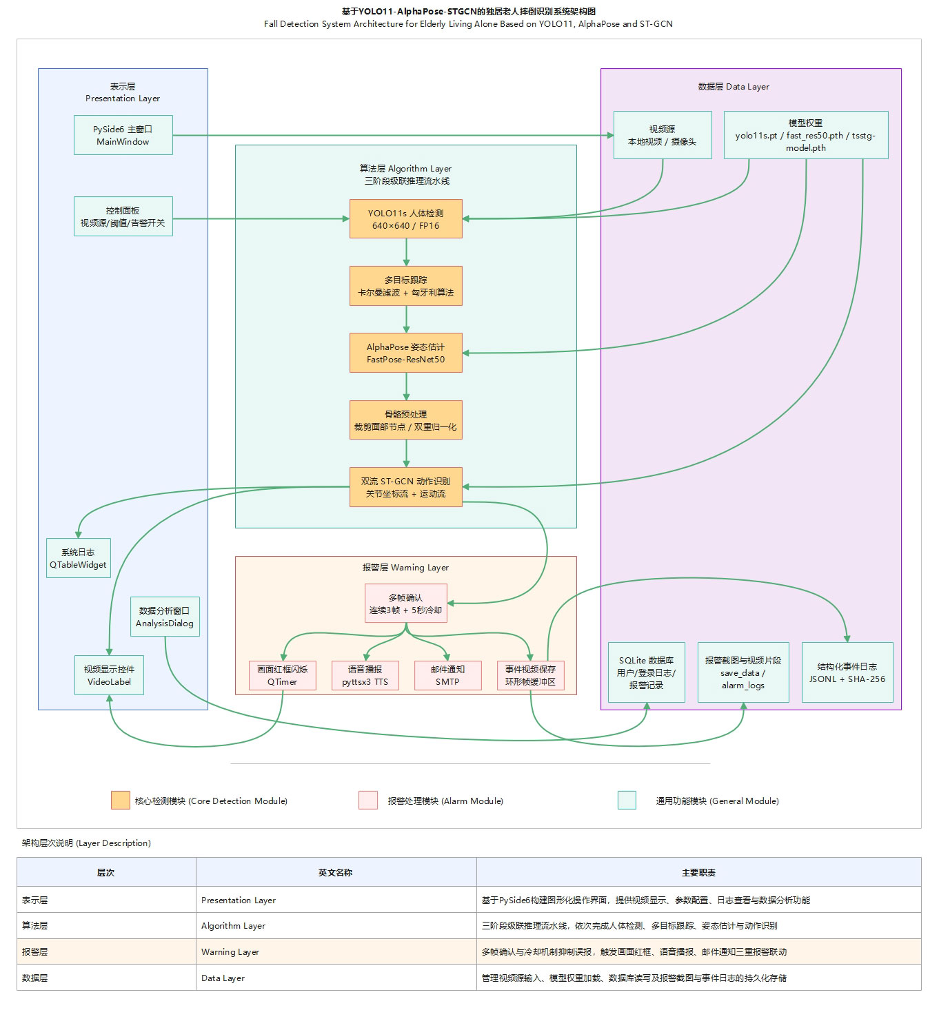 系统采用表示层(PySide6界面)、算法层(YOLO11n检测→卡尔曼跟踪→AlphaPose姿态估计→双流ST-GCN动作识别)、报警层(多帧确认+语音/邮件/红框三重联动)、数据层(SQLite+JSONL日志)四层架构。