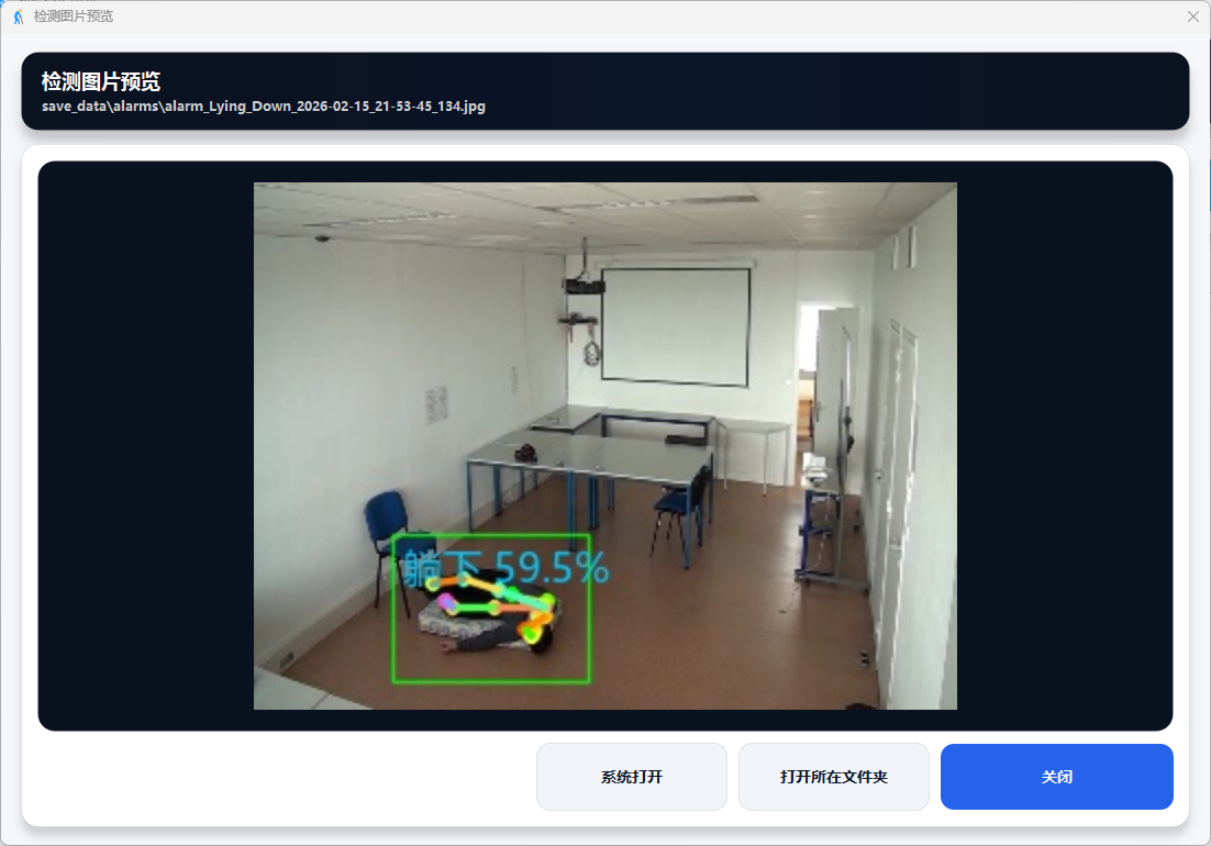 本系统基于骨骼关键点进行动作分类,不依赖人体外观特征,天然保护被监护者隐私;双流ST-GCN联合建模姿态形态与运动速度,有效区分摔倒与躺下等易混淆动作;三阶段级联架构全程GPU部署,满足实时处理需求;多帧确认与多级冷却机制逐层抑制误报;事件视频自动保存与SHA-256校验日志形成完整证据链;PySide6图形界面集成检测、报警、管理与数据分析功能,开箱即用,部署成本低,适用于独居老人居家监护与养老机构智能管理等场景。