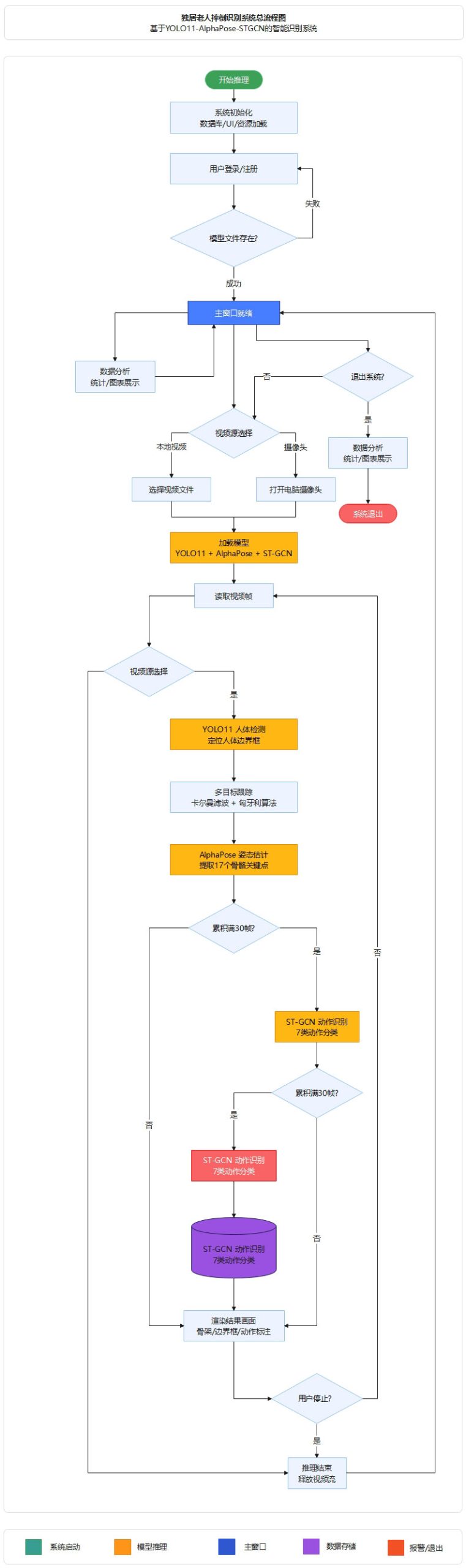 图5 基于YOLO11-AlphaPose-STGCN的独居老人摔倒识别系统总流程图