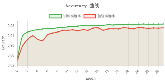 模型经 30 轮训练后,训练准确率达 98.71%,验证准确率 97.26%,验证损失收敛至 0.1726,训练与验证差距约 1.45%,无明显过拟合。