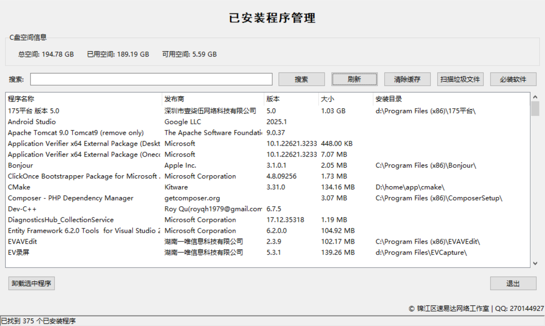 在日常使用电脑的过程中,随着安装的软件越来越多,系统盘(通常是C盘)的空间往往变得捉襟见肘。尤其是当C盘空间不足时,电脑运行速度会明显下降,甚至影响系统稳定性。为了解决这一问题,锦江区速易达网络工作室 推出了一款实用的"已安装程序管理"工具,帮助用户轻松管理软件、清理系统垃圾、释放磁盘空间。