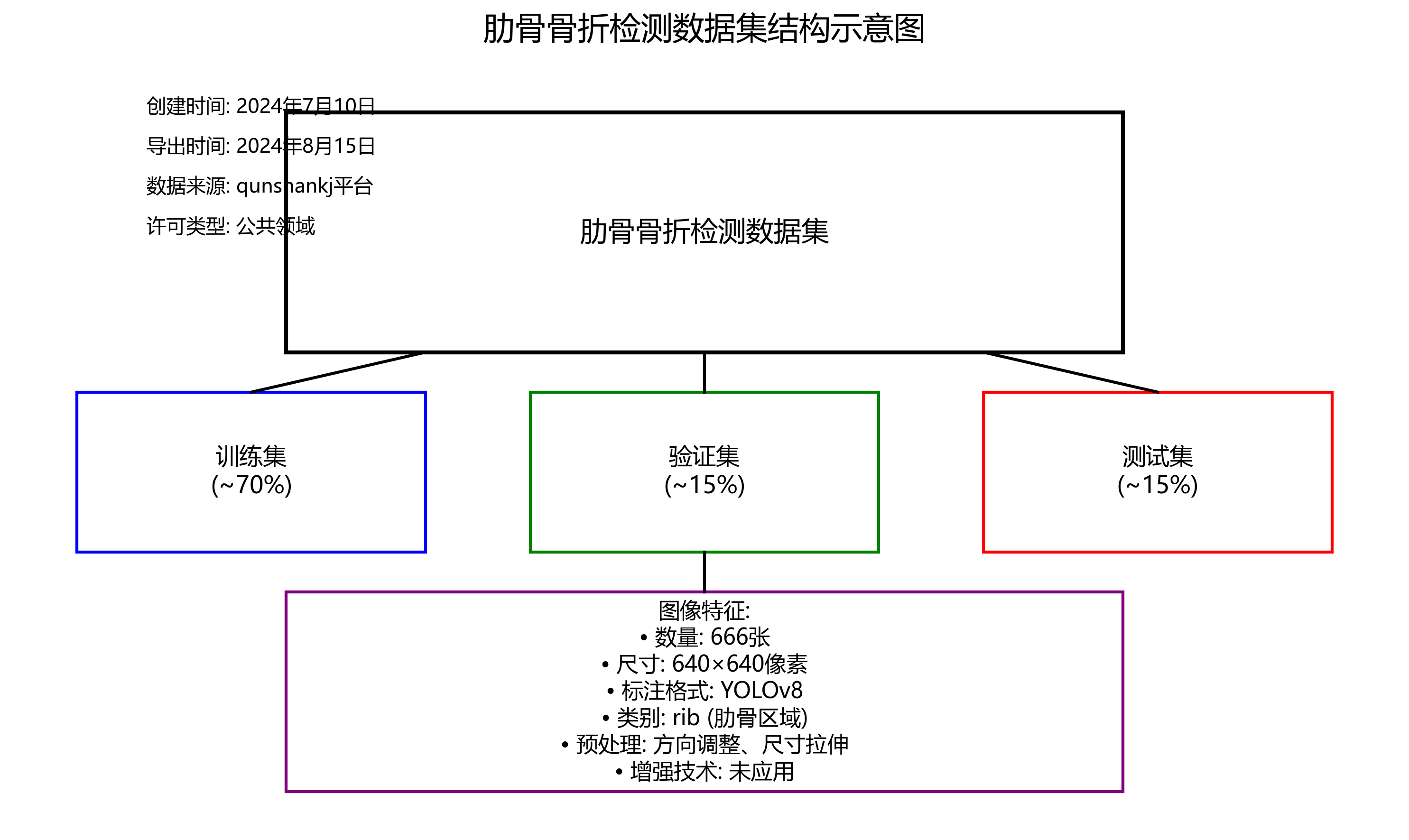 本数据集为肋骨骨折检测数据集,采用YOLOv8格式标注,共包含666张图像。数据集通过qunshankj平台于2024年7月10日创建,并于同年8月15日导出。所有图像均经过预处理,包括自动调整像素方向(剥离EXIF方向信息)和拉伸至640×640像素尺寸,但未应用任何图像增强技术。数据集划分为训练集、验证集和测试集,仅包含一个类别'rib',代表肋骨区域。数据集采用公共领域许可,由qunshankj用户提供。该数据集旨在支持计算机视觉模型在医学影像领域中肋骨骨折的自动检测任务,通过标注的肋骨区域帮助算法学习识别骨折特征,为临床诊断提供辅助工具。