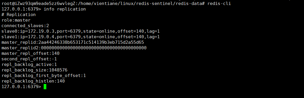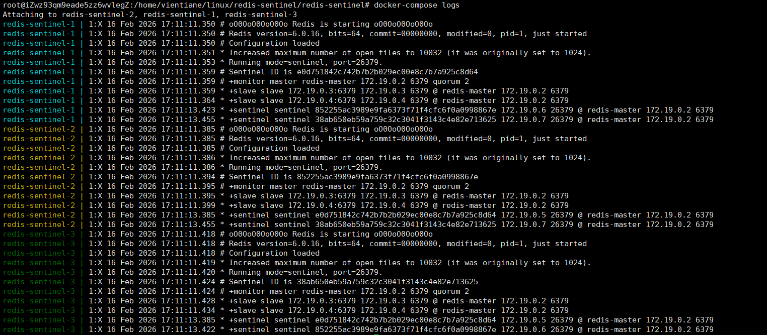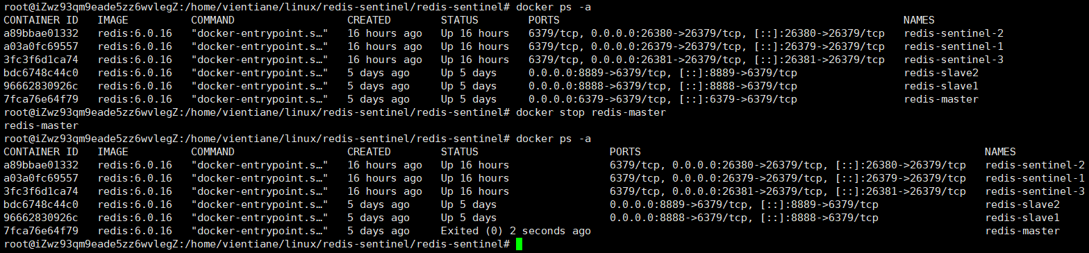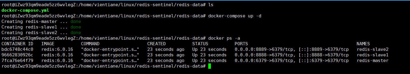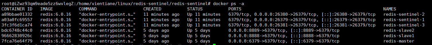 使用docker ps -a可以查看到哨兵节点和数据节点都在正常工作。