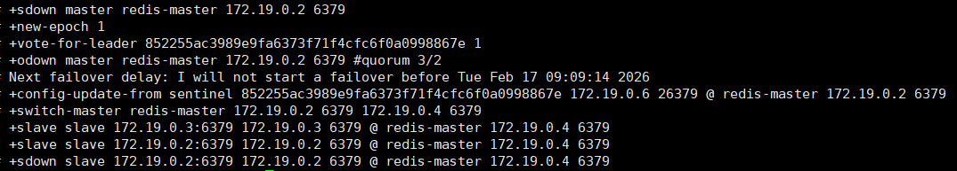 - 查看哨兵节点的日志,sdown表示主观下线,仅代表本哨兵节点认为主节点挂了,odown表示客观下线,表示好几个哨兵节点认为主节点挂了,法定票数达成一致,switch表示主节点从172.19.0.2转换到172.19.0.4了。