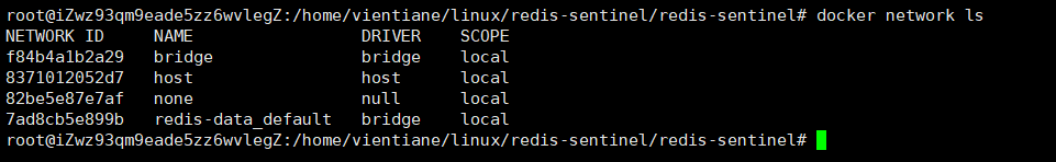 3个redis节点和3个哨兵节点默认不在同一个局域网,所以需要把两组服务放在同一个局域网中,可以使用docker network ls查看docker局域网里的内容: