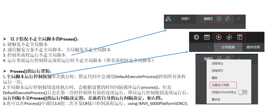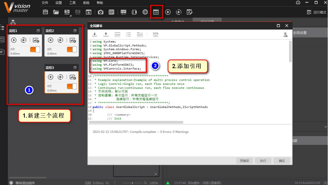 在VM中,全局脚本作为VM的全局资源,使用C#编程,支持调用3.X版本的C#接口,可用于多流程的逻辑控制。