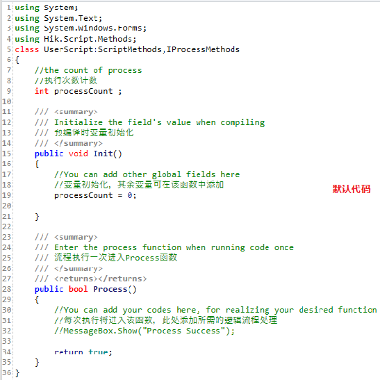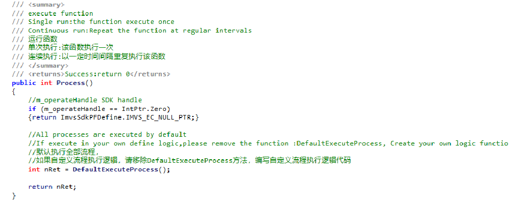 | public int Process(){} | 运行函数为主界面上运行控制按钮执行的函数,单次执行则执行一次Process()函数,连续运行则以一定时间间隔重复执行Process()函数 |