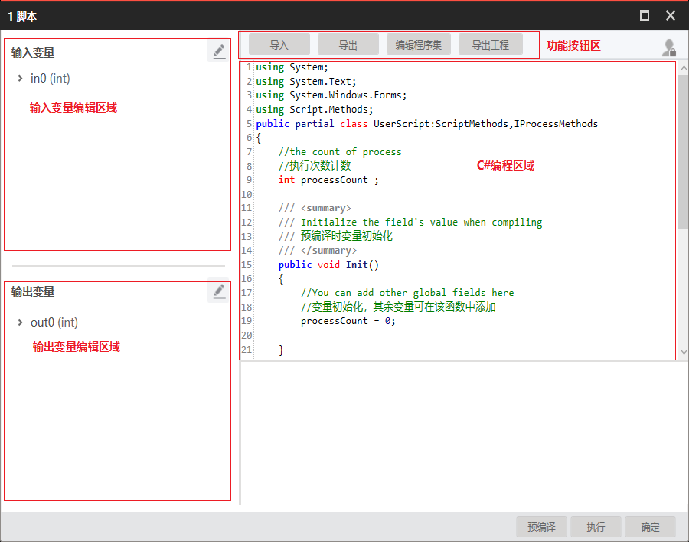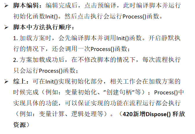 | public int Init(){} | 初始化函数,会在加载方案或者编译时执行。可在此方法中实现初始化相关操作。 |