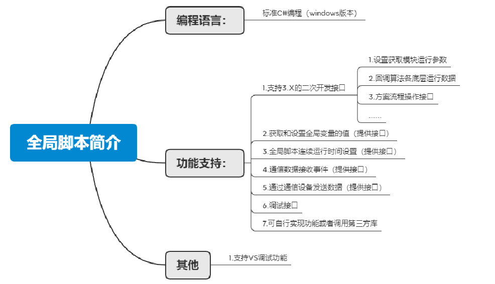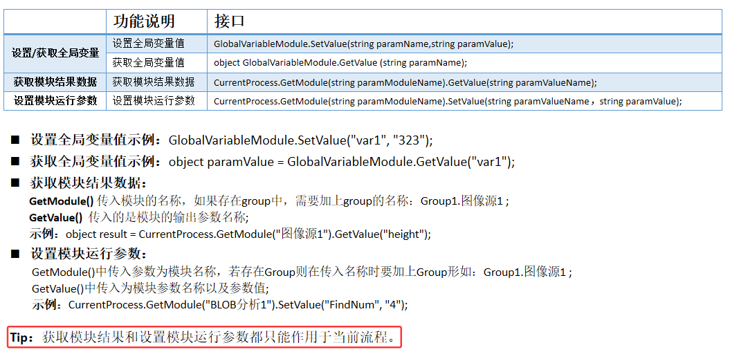 支持全局变量参数的获取与修改,支持接收通信数据,支持获取或修改模块参数,支持获取流程或模块运行状态和结果等。