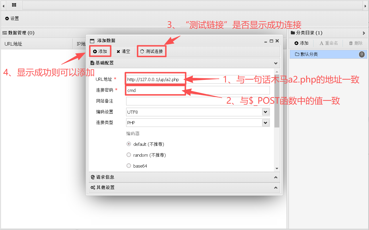 ① URL地址要与已经上传的一句话木马地址一致,即a2.php的地址。连接密码要与$_POST[]中所设的值一致,即"cmd"为连接密码。参数最终设置如下: