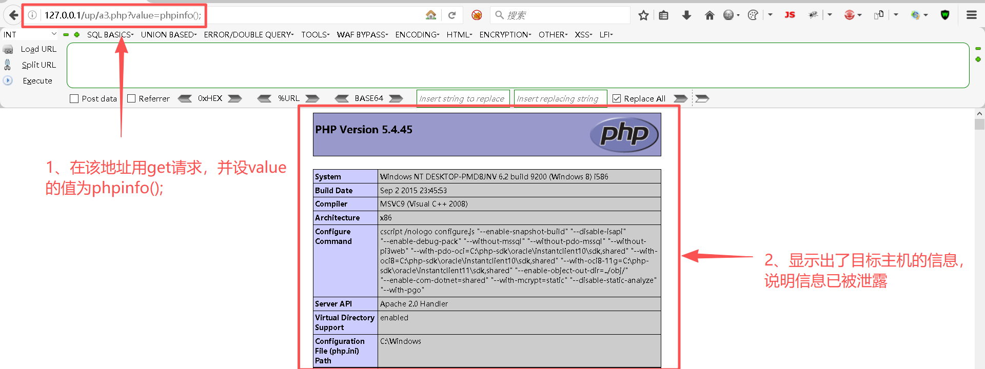 通过在a2.php中写入了一句话木马,使得卧底a2.php将目标服务器的系统信息给泄露了。
