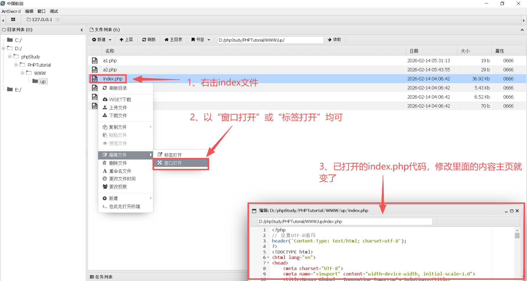 说明: 位于D:\phpStudy\PHPTutorial\WWW\up\index.php的文件原来长什么样不重要,重要的是通过蚁剑能修改目标站点的主页面。当然,index.php文件也可以通过蚁剑上传并将其替换。