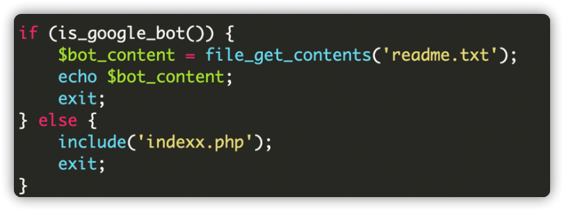 index.php 识别到 UA(User-Agent)包含 Googlebot 等关键词 → 读取 readme.txt → 输出整页博彩垃圾内容,让搜索引擎收录。