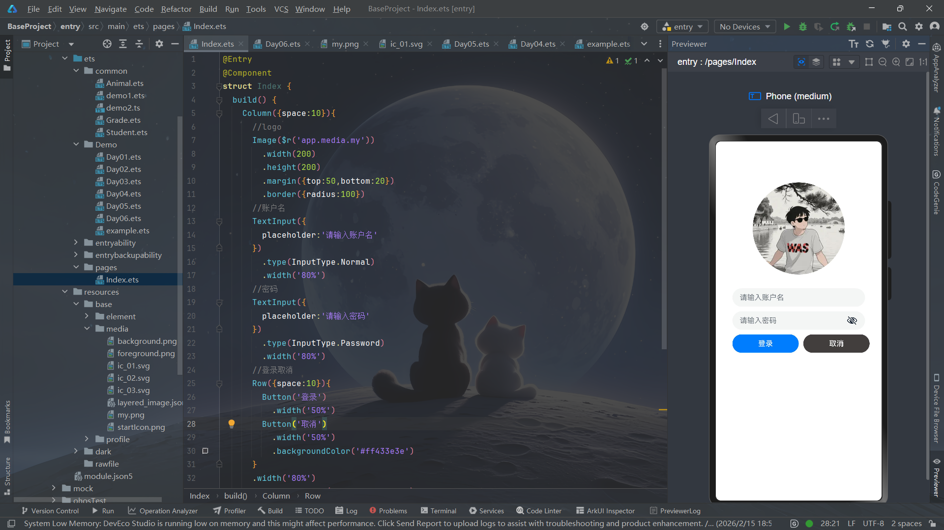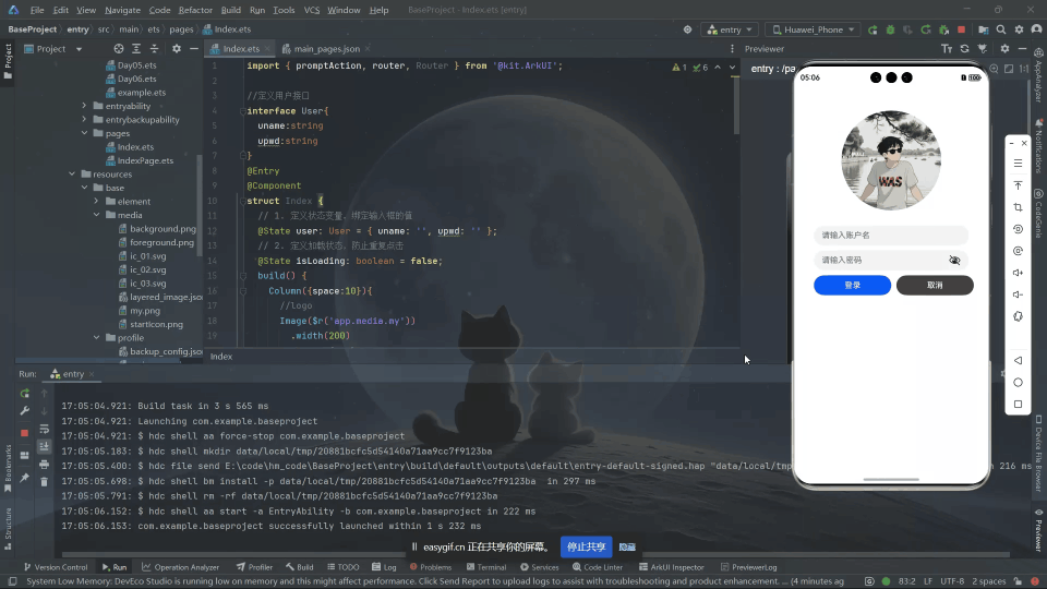 Row({ space: 10 })简洁实现等分布局;- 登录按钮文字动态切换,提升用户体验;