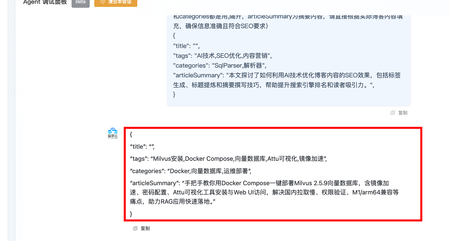 "articleSummary": "保姆级教程教你用 Docker Compose 一键部署 Milvus 2.5.9 向量数据库,含镜像加速、密码配置、Attu 可视化工具安装与 Web UI 访问,全程命令复制即用,轻松搭建高性能 RAG 存储后端。"