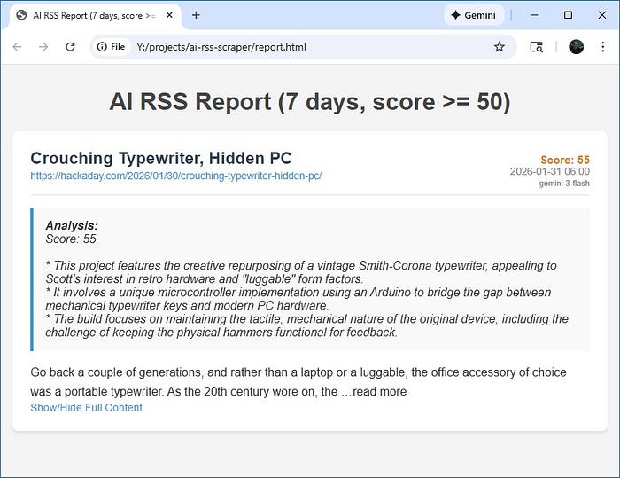 报告已生成我们可以看到,一篇分数 ≥ 50 的文章被选中,它是关于将打字机重新用作可携带计算机的那篇。LLM 列出了三个关于为什么它认为这文章对我有趣的原因。LLM 的好处是我们不必进行精确的字符串匹配。我们描述我们想要的,LLM 能够匹配它并生成分数。结果中有一些变化。如果您多次重新运行 LLM,您可能会得到另一个分数。例如,我看到同一篇文章为我评分为 55、57 和 60。