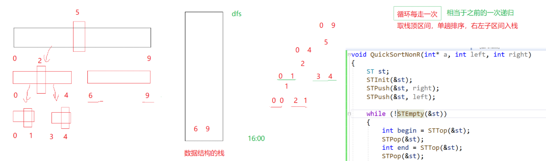 循环每走一次,相当于一次递归,取栈顶区间,单趟排序完了之后,先右再左进行子区间入栈