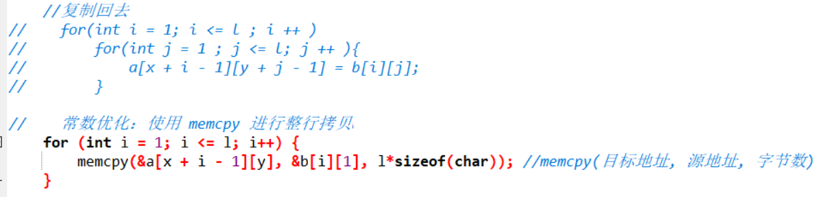 memcpy(&a[x + i - 1][y], &b[i][1], l*sizeof(char)); //memcpy(目标地址, 源地址, 字节数)