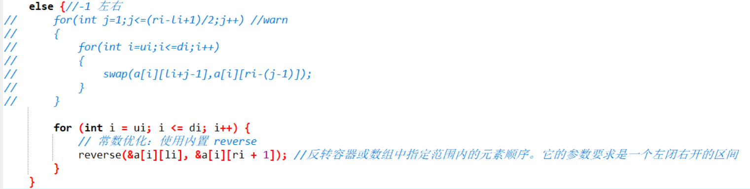reverse(&a[i][li], &a[i][ri + 1]); //反转容器或数组中指定范围内的元素顺序。它的参数要求是一个左闭右开的区间
