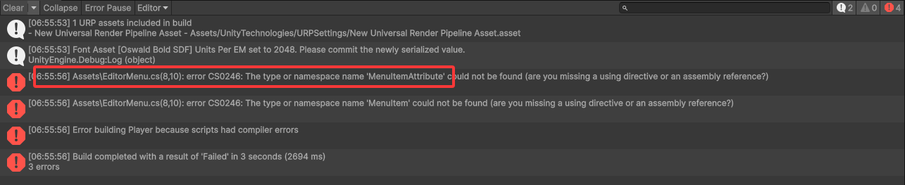 UnityEditor.dll程序集。此时,如果任何一个非"Editor"文件夹下的脚本中包含了对UnityEditor的引用,编译器就会因为找不到这个程序集而报错,导致打包失败 。 -