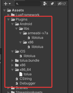 存放插件的核心目录,用于集成第三方代码,必须为Assets的子目录,该目录下的脚本会优先编译。比如下图是ToLua的插件目录,实测2019以后的Unity版本Plugins内的文件也可放到任意目录。