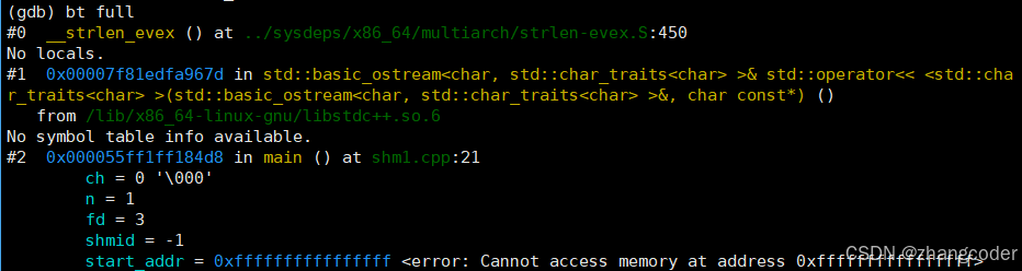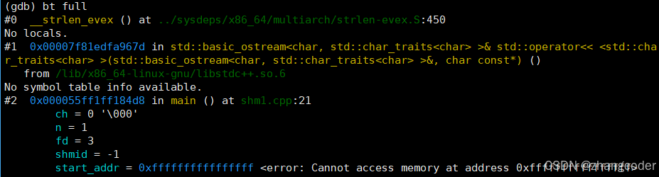 shm1.cpp中使用了std::cout<<start_addr<<std::endl,为std::cout<<(char*)0xffffffffffffffff<<std::endl肯定不行,所以报"Segmentation fault"
