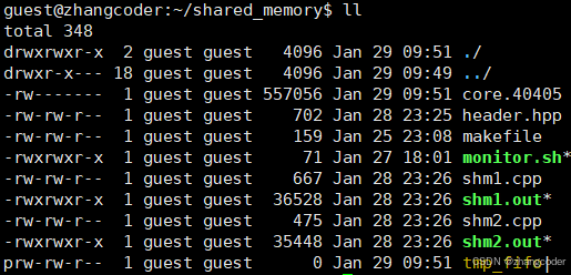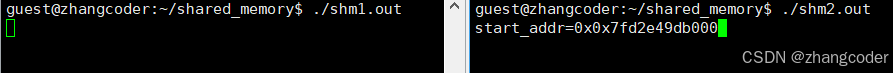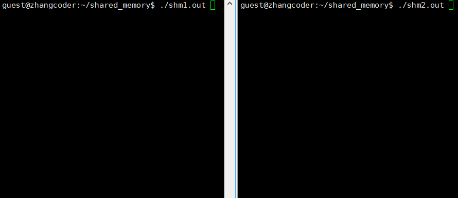 编译以上代码,然后先运行shm1.out,再运行shm2.out: