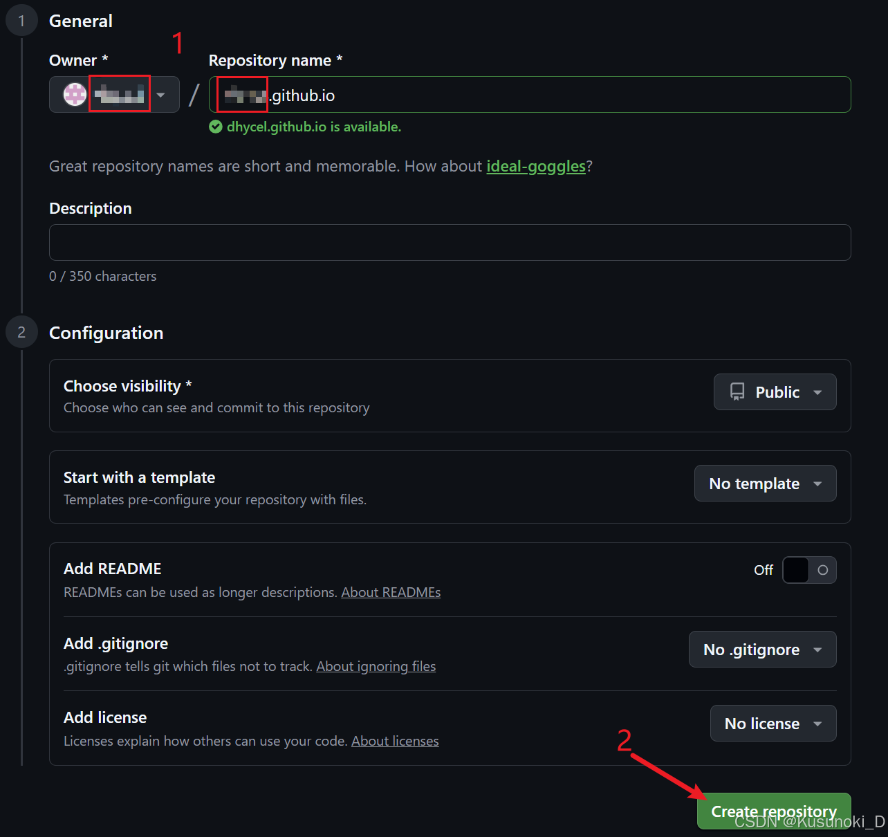 填写 "Repository name",红框中的内容需一致,即:[username]/[username].github.io