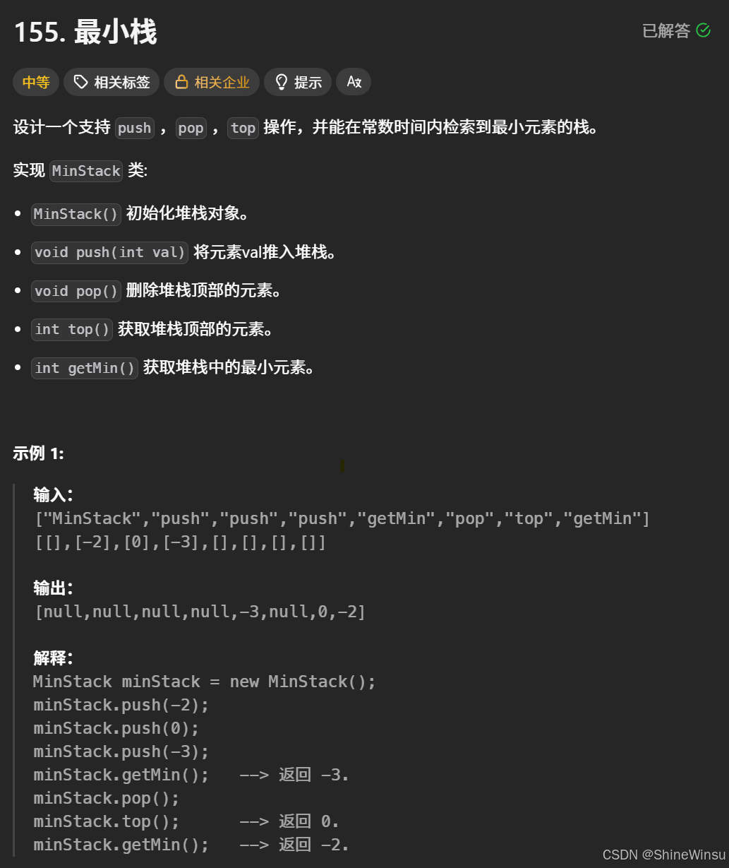 MinStack():初始化栈对象。void push(int val):将元素val压入栈。void pop():删除栈顶元素。int top():获取栈顶元素。int getMin():获取栈中的最小元素,且需在常数时间内完成。