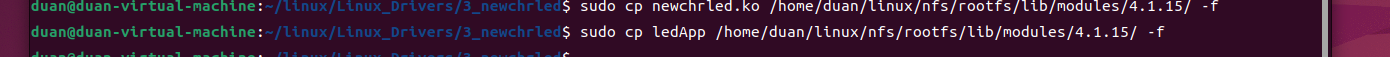 sudo cp newchrled.ko /home/duan/linux/nfs/rootfs/lib/modules/4.1.15/ -f