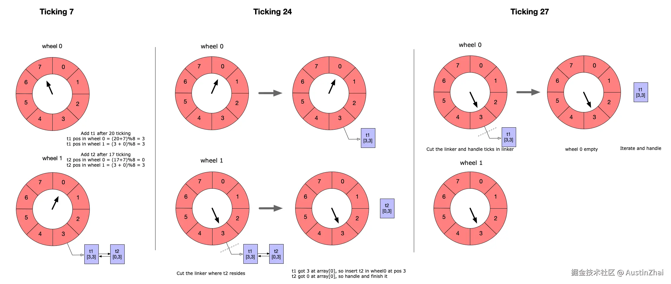 - 第7tick:添加从现在开始第20个tick的t1和第17个tick的t2,按照计算,t1和t2都插入在第2层时间轮的第3 slot里。